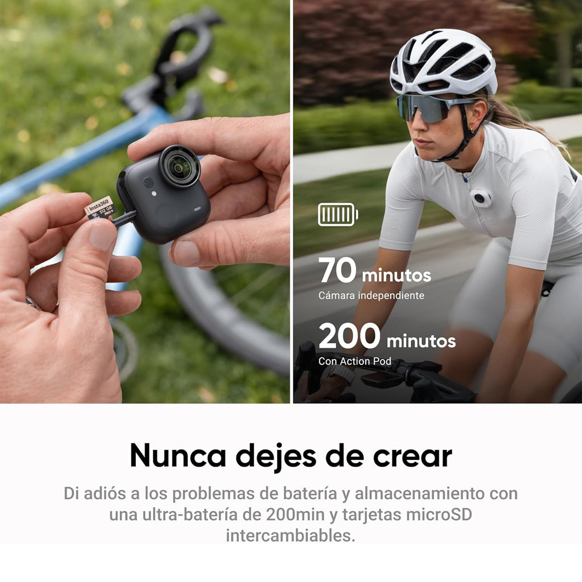 Tiempo de funcionamiento de 200 minutos y carga rápida: Graba durante 70 minutos con la cámara independiente y 3 horas en el Action Pod, luego pasa del 0 al 80 % en solo 12 minutos.