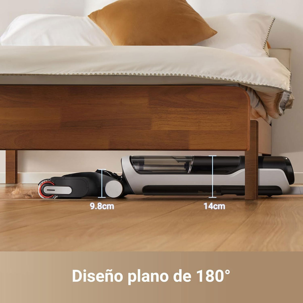 Su diseño biomimético permite que la H14 se mantenga pegada al piso incluso en posición totalmente horizontal. Llega a espacios de apenas 14 cm (cuerpo completo) y 9.8 cm (solo cabezal), ideal para limpiar debajo de camas, muebles y zonas difíciles. Su motor especial mantiene el agua sucia lejos del sistema incluso al estar completamente plana.