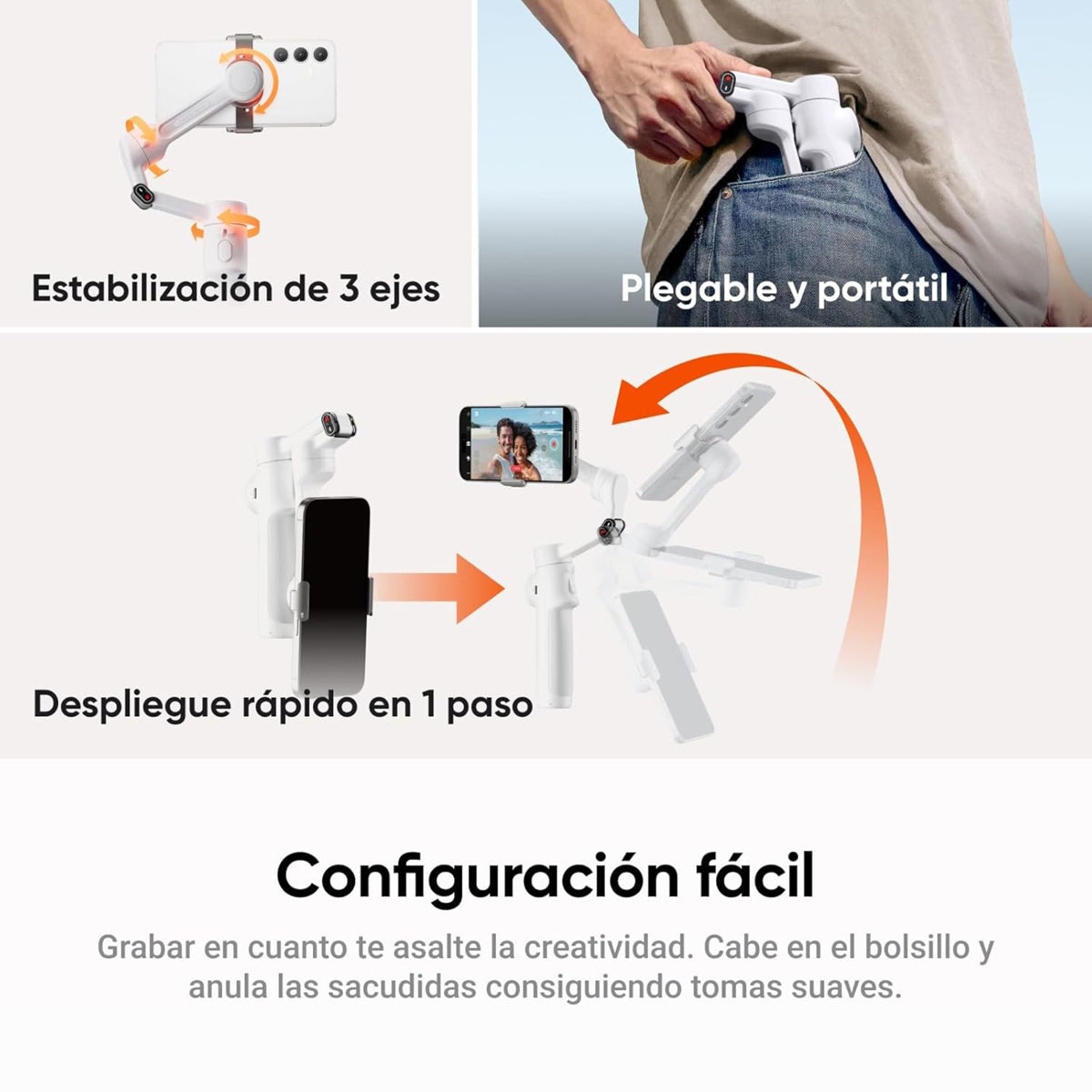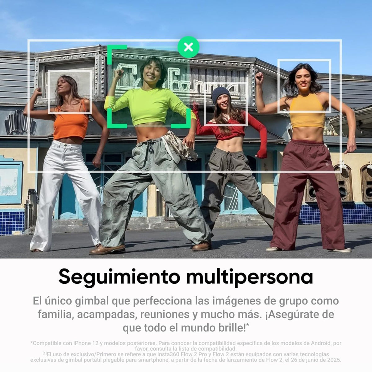 El Insta360 Flow 2 es un gimbal inteligente todo en uno para teléfonos. Integra trípode, palo selfie, teleprompter y batería externa de hasta 10 horas. El Seguimiento de Zoom Activo permite seguir movimientos rápidos incluso con un zoom de hasta 15x. También cuenta con seguimiento multipersona para grabar grupos y reuniones sin perder el encuadre.