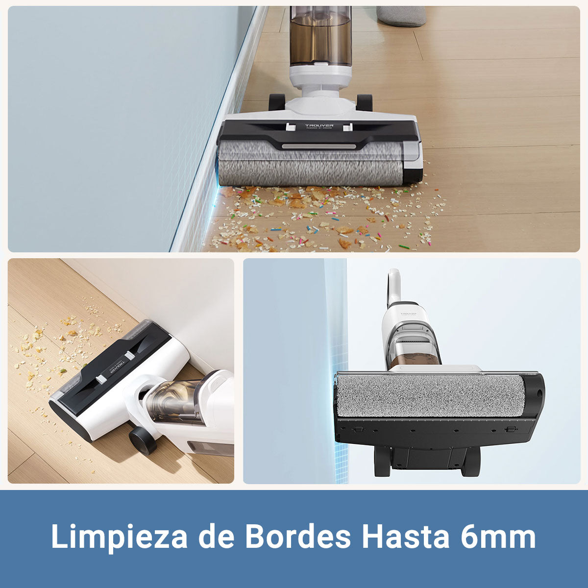 El cepillo de bordes alcanza espacios de hasta 6 mm pegados a paredes y zoclos. El raspador doble integrado evita que el cabello se enrede en el rodillo, manteniendo el rendimiento estable.