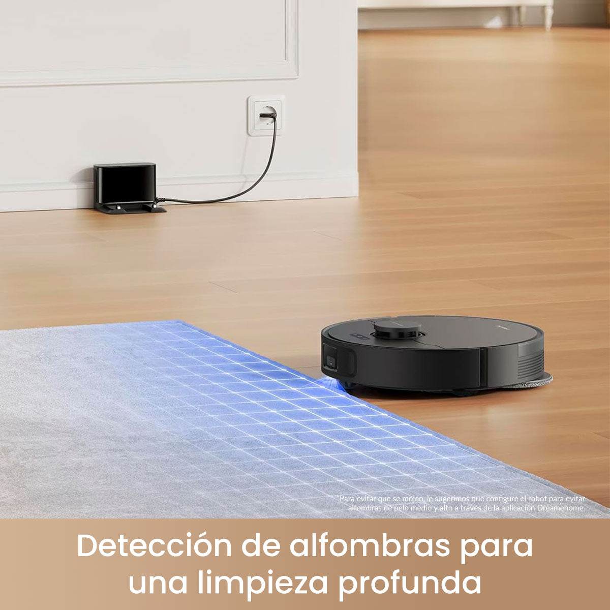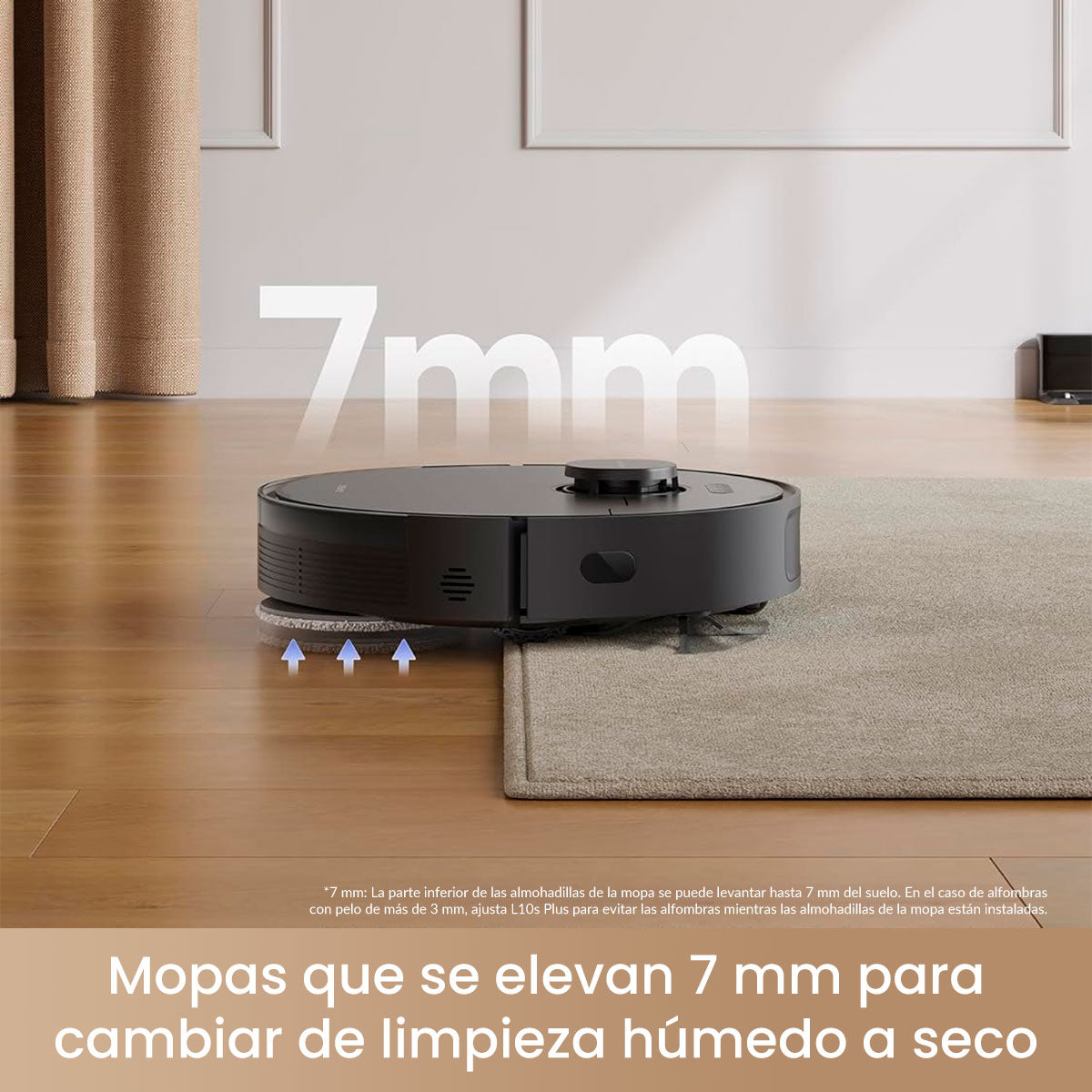 El robot detecta automáticamente las alfombras y ajusta la potencia para limpiarlas a profundidad. Además, eleva las mopas hasta 7 mm para evitar mojarlas, protegiendo tus tapetes y manteniendo su durabilidad.