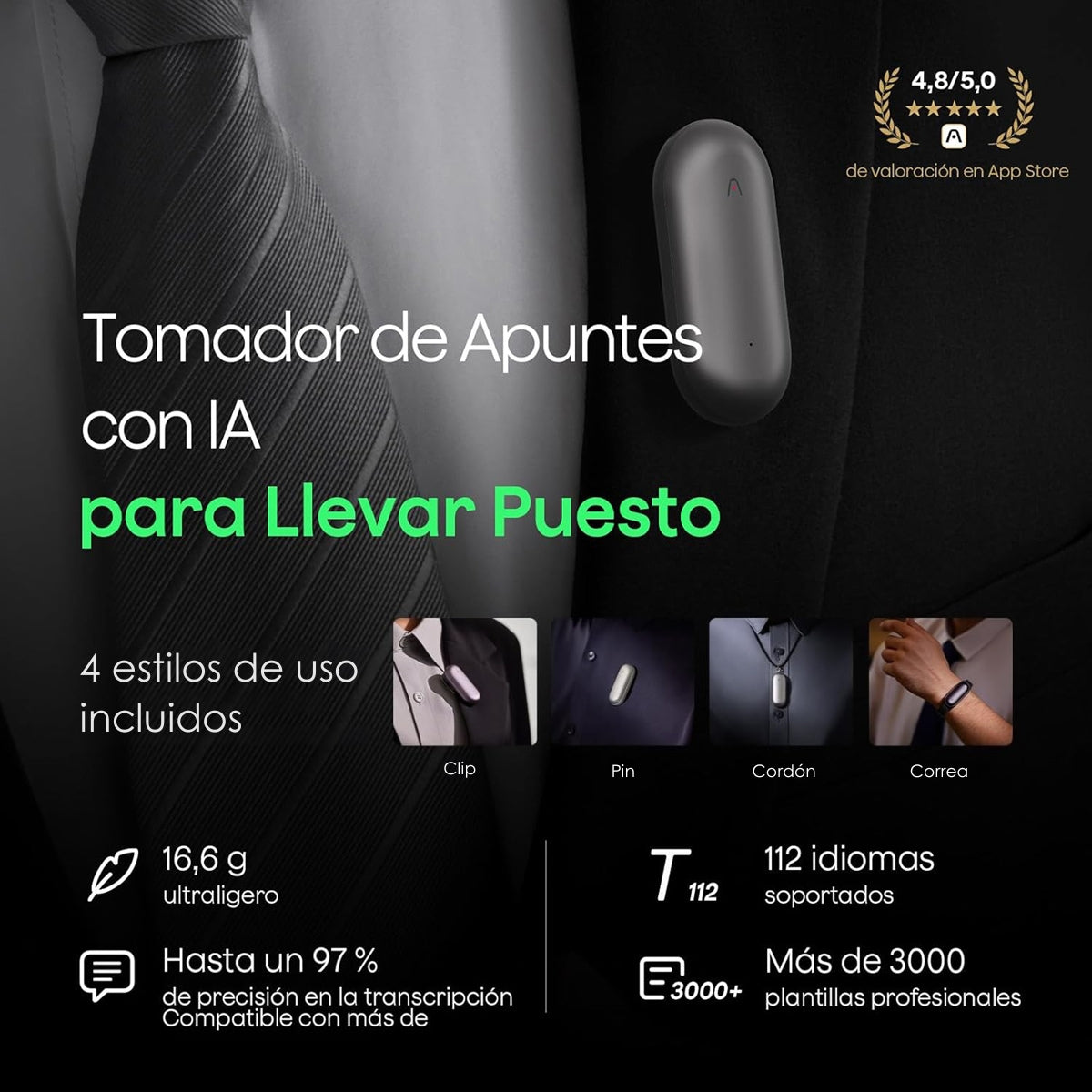 Plaud NotePin grabadora de voz con IA con solo 17g de peso y 20 horas de batería, transcribe en 112 idiomas y genera resúmenes y listas para profesionales. Su diseño compacto incluye cancelación de ruido y almacenamiento en la nube ilimitado con cifrado para máxima privacidad. La correa para cuello y pulsera están hechas a medida ofreciendo un ajuste perfecto y seguro con instalación rápida y sin herramientas. Nota: no usar en el pecho si se tiene marcapasos por su magnetismo.