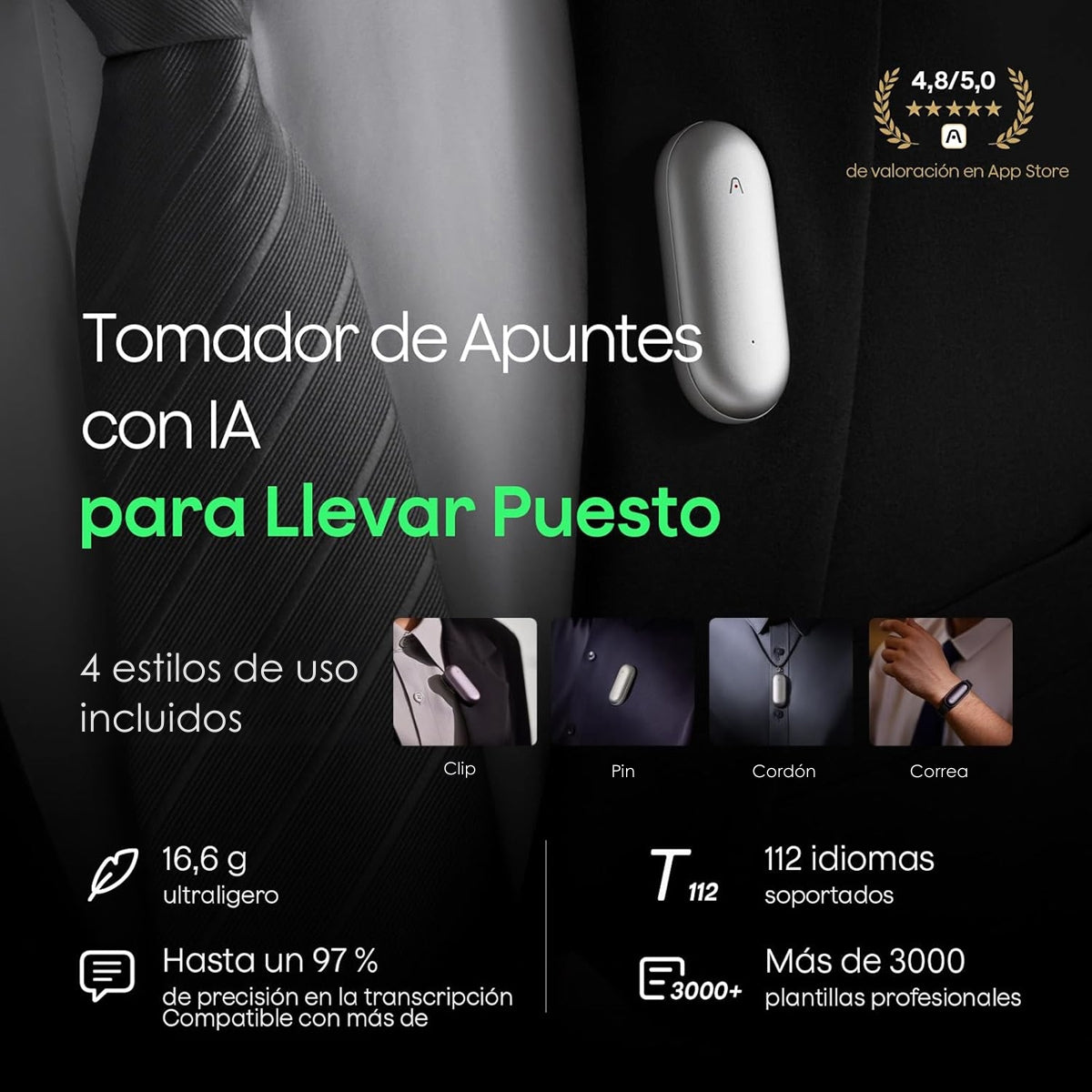 Plaud NotePin grabadora de voz con IA con solo 17g de peso y 20 horas de batería, transcribe en 112 idiomas y genera resúmenes y listas para profesionales. Su diseño compacto incluye cancelación de ruido y almacenamiento en la nube ilimitado con cifrado para máxima privacidad. La correa para cuello y pulsera están hechas a medida ofreciendo un ajuste perfecto y seguro con instalación rápida y sin herramientas. Nota: no usar en el pecho si se tiene marcapasos por su magnetismo.