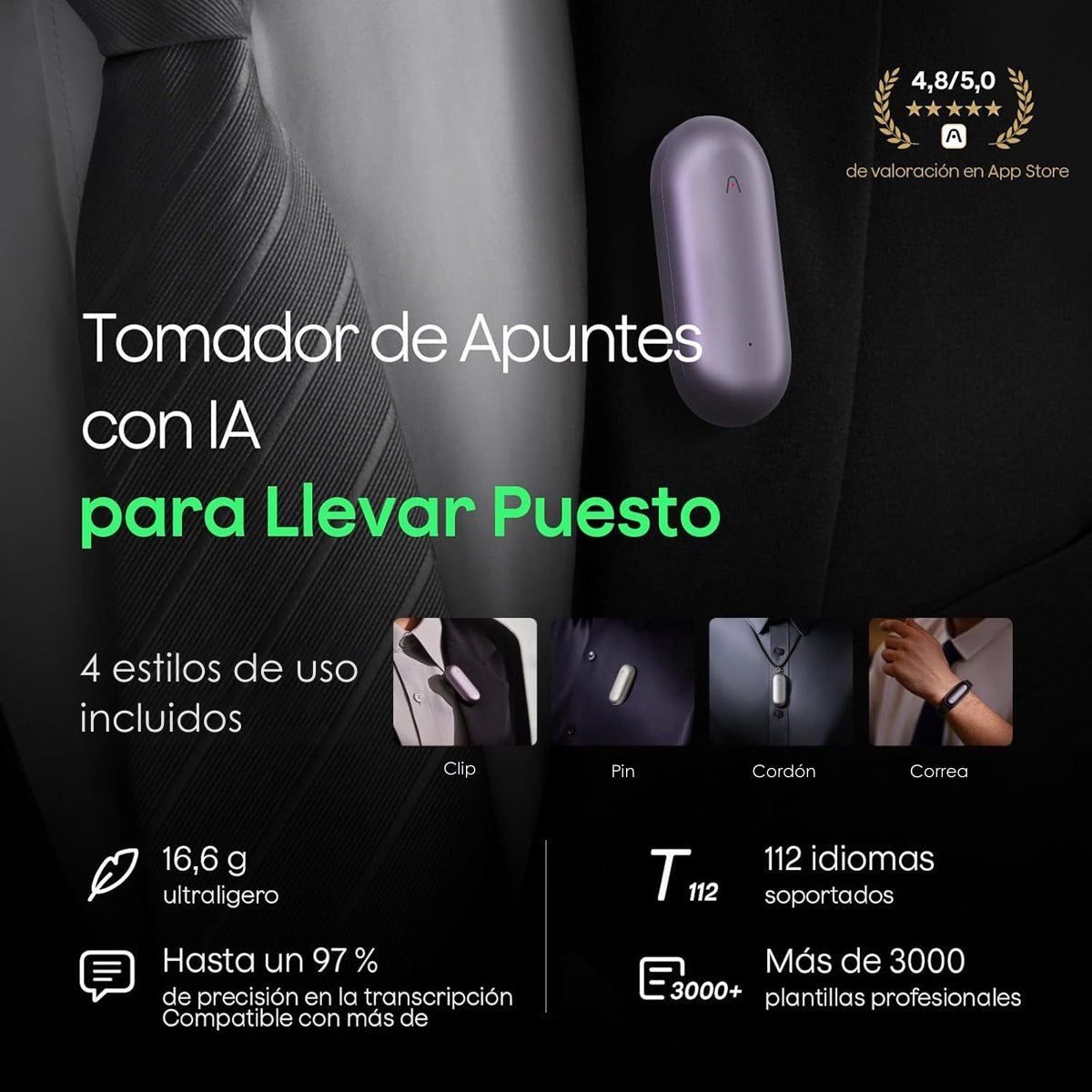 Plaud NotePin grabadora de voz con IA con solo 17g de peso y 20 horas de batería, transcribe en 112 idiomas y genera resúmenes y listas para profesionales. Su diseño compacto incluye cancelación de ruido y almacenamiento en la nube ilimitado con cifrado para máxima privacidad. La correa para cuello y pulsera están hechas a medida ofreciendo un ajuste perfecto y seguro con instalación rápida y sin herramientas. Nota: no usar en el pecho si se tiene marcapasos por su magnetismo.
