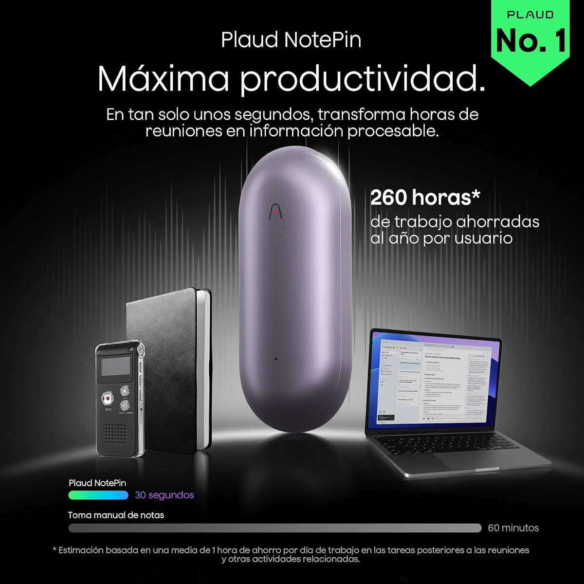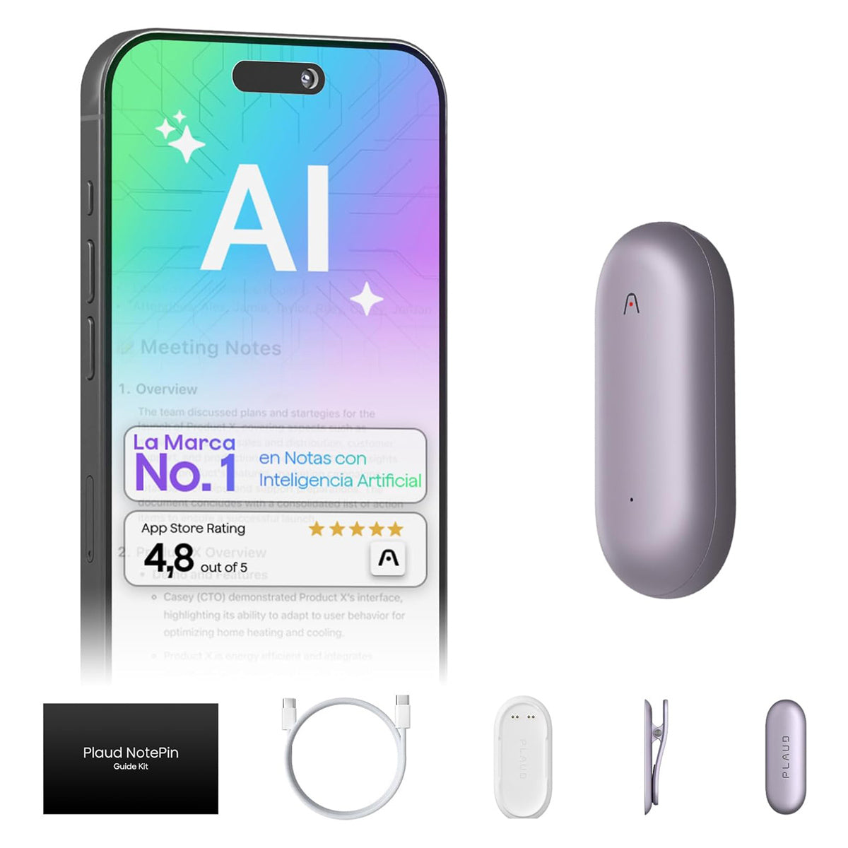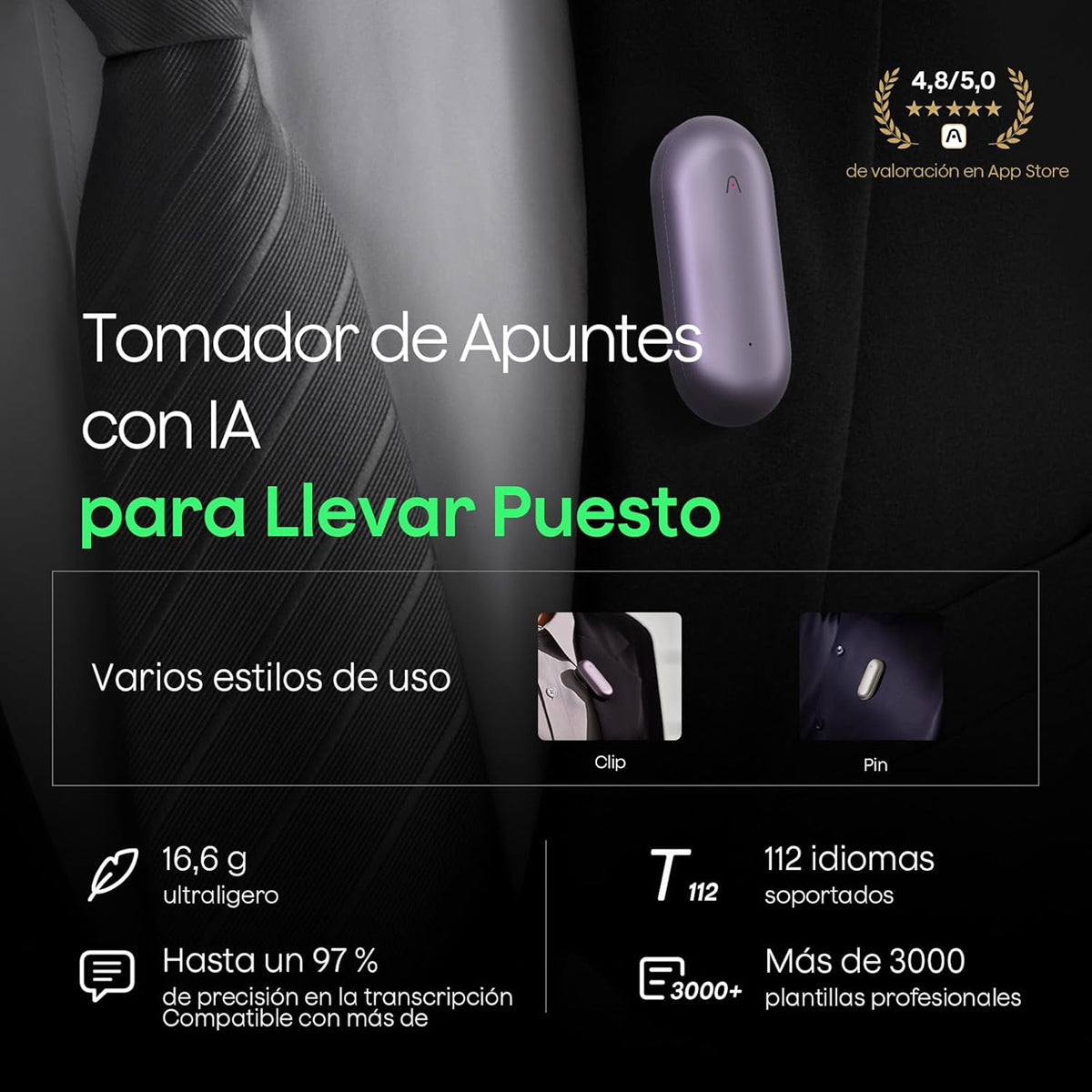 Plaud NotePin es el transcriptor con IA más compacto para profesionales. Con solo 17 gramos, se sujeta a tu ropa con su pin magnético para grabar sin manos. Su IA, con modelos como GPT-5, transcribe y resume automáticamente tus grabaciones en 112 idiomas, generando mapas mentales y listas de tareas al instante. Disfruta de 20 horas de autonomía, almacenamiento ilimitado en la nube con total privacidad y 300 minutos gratis de transcripción mensual. Incluye base de carga y es localizable con la app Buscar de Apple. La productividad inteligente nunca fue tan pequeña.
