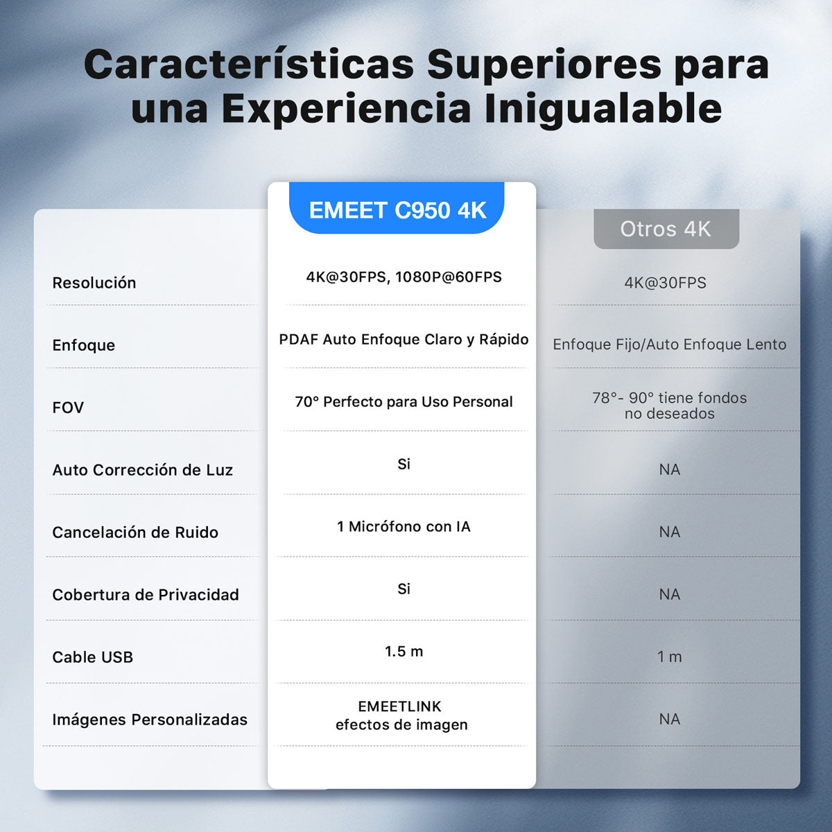 La EMEET C950 4K ofrece videollamadas con claridad ultra alta gracias a sus 8 megapíxeles y resolución 4K UHD. Con autoenfoque PDAF, corrección automática de luz y micrófono con cancelación de ruido, mantiene una imagen estable y profesional incluso en entornos complicados. Su campo de visión de 70° es ideal para uso personal o reuniones pequeñas donde se requiere privacidad visual y encuadre cerrado.