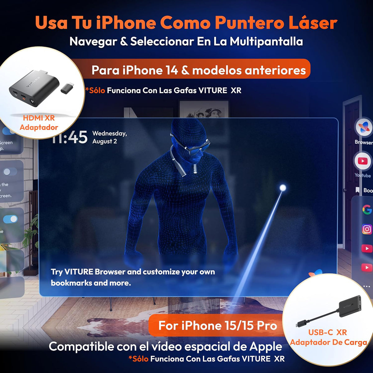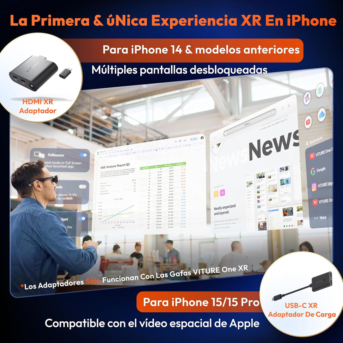 ¡Desbloquea el potencial de tu iPhone! Con el adaptador HDMI XR, puedes transformar tu iPhone 14 o un modelo anterior en una estación de trabajo XR portátil con múltiples pantallas virtuales, compatibilidad mejorada con 3DoF y video VR, y una experiencia de cine móvil en la pantalla virtual de 120" de las gafas VITURE XR. Optimizado para conectar tus consolas compatibles con HDMI para una experiencia de juego más inmersiva en VITURE. Y no dejes que la batería te afecte. ¡Con el adaptador HDMI de VITURE, puedes jugar y cargar tu iPhone al mismo tiempo! Descripción larga ¡Desbloquea el potencial de tu iPhone! Con el adaptador HDMI XR, puedes transformar tu iPhone 14 o un modelo anterior en una estación de trabajo XR portátil con múltiples pantallas virtuales, compatibilidad mejorada con 3DoF y video VR, y una experiencia de cine móvil en la pantalla virtual de 120" de las gafas VITURE XR. Conectividad perfecta para dispositivos Lightning: Compatible con el adaptador AV digital a Lightning de Apple, ideal para usar gafas XR en modelos con conector Lightning. Desbloquea funciones XR avanzadas: Disfruta de múltiples pantallas, 3DoF, video VR y más a través de la app exclusiva SpaceWalker. Optimizado para consolas de videojuegos: Conéctate fácilmente a consolas HDMI como PlayStation, Xbox y otras para una experiencia inmersiva. Energía portátil: Hasta 2.8 horas de reproducción o carga para que sigas conectado donde sea. Incluye adaptador micro-USB a Lightning: Todo lo que necesitas para comenzar a usarlo de inmediato. Nota: Las gafas XR no están incluidas.