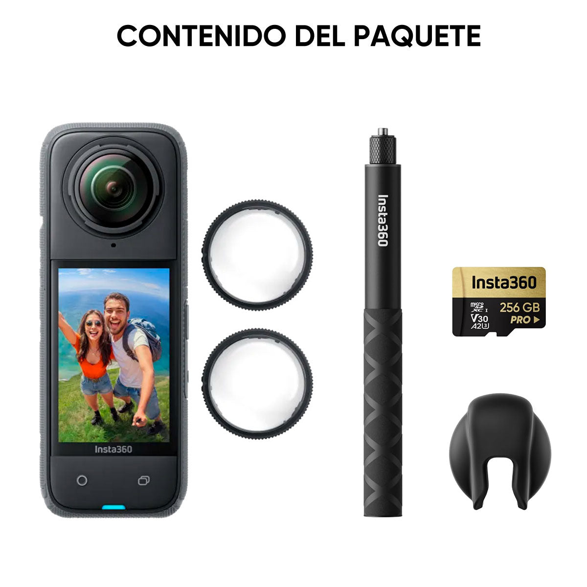 Incluye un Selfie Stick Invisible para crear vídeos envolventes sin obstáculos visibles, Tarjeta de Memoria SD de 256GB y Protectores de Lentes. También funciona como cámara de acción con resolución 4K a 60 fps y ultra gran angular de 170º a 4K/30 fps.