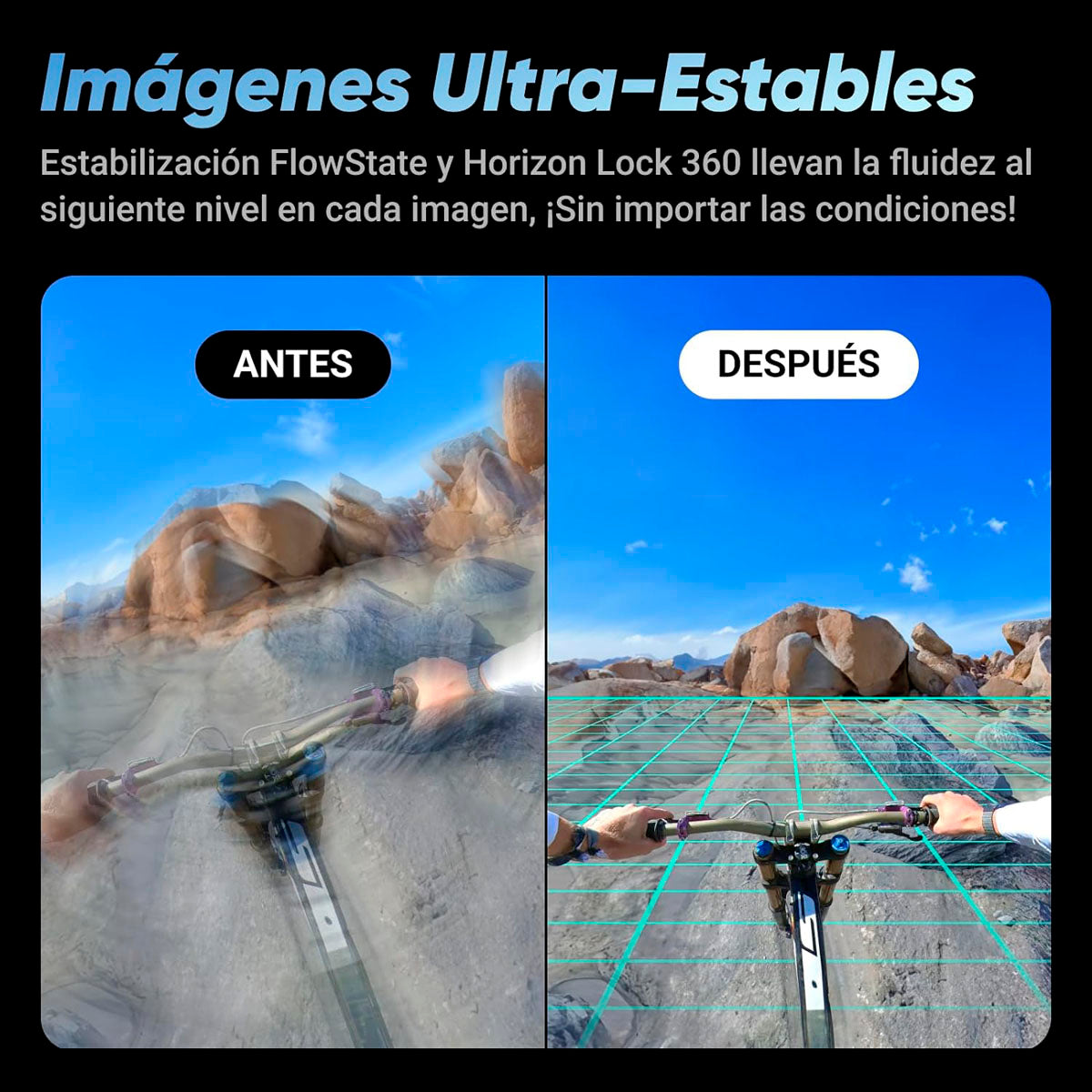 Ofrece estabilidad superior con tecnología de Estabilización FlowState y Horizon Lock 360º, garantizando imágenes fluidas en cualquier situación. La X4 es resistente y duradera, con protección contra golpes y condiciones extremas.