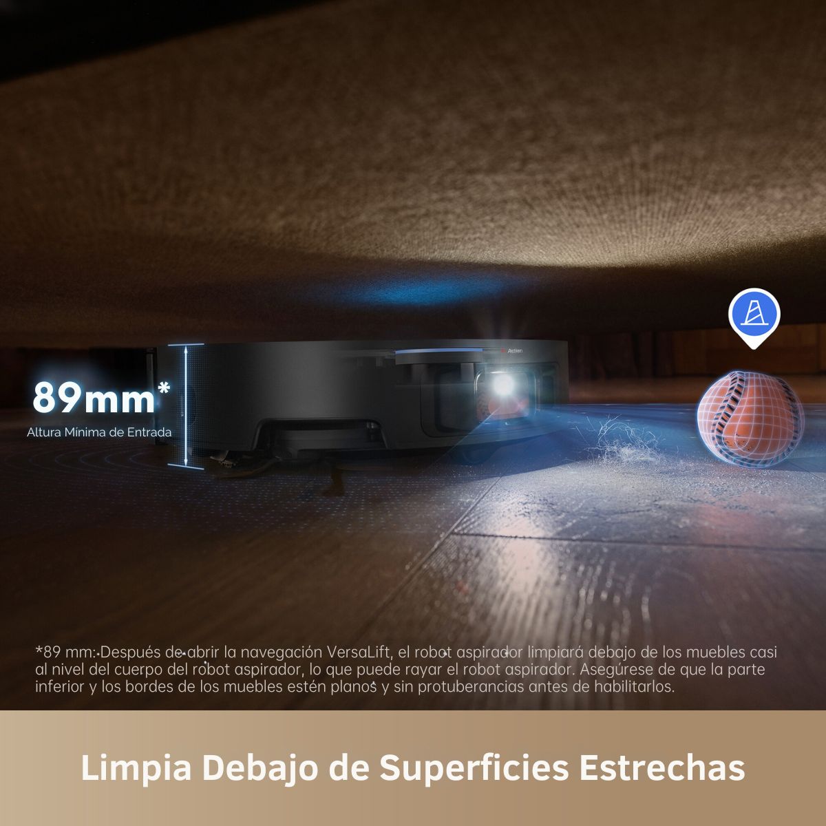 Su exclusivo sistema de pie mecánico le permite superar obstáculos de hasta 6 cm, ideal para hogares con umbrales altos o barandales deslizantes. A esto se suma su LiDAR autoelevable, que ajusta la altura para limpiar bajo camas, sofás y muebles bajos sin quedar atrapado.