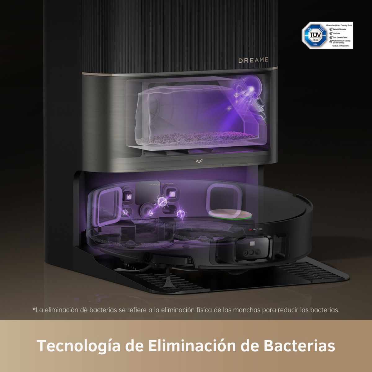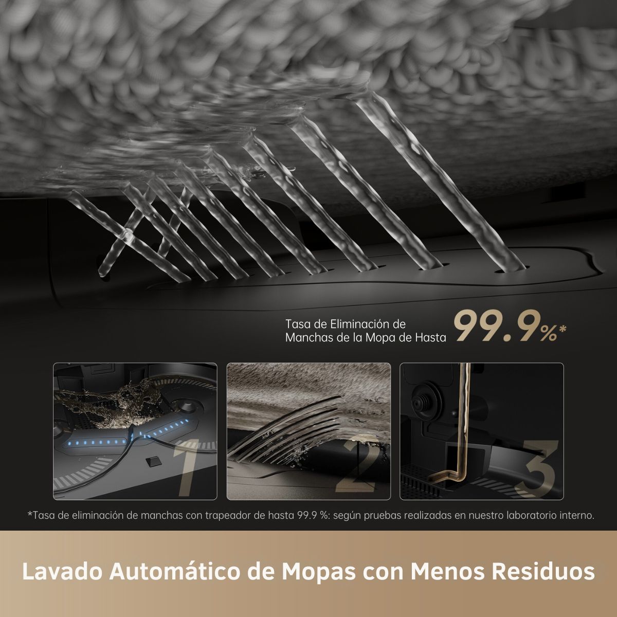 La estación de carga inteligente incluye lavado de mopas con agua caliente a 80°C, electrólisis e iones de plata para eliminar bacterias, olores y manchas difíciles. Además, puedes personalizar temperatura, volumen de agua y parámetros de sanitización desde la app.