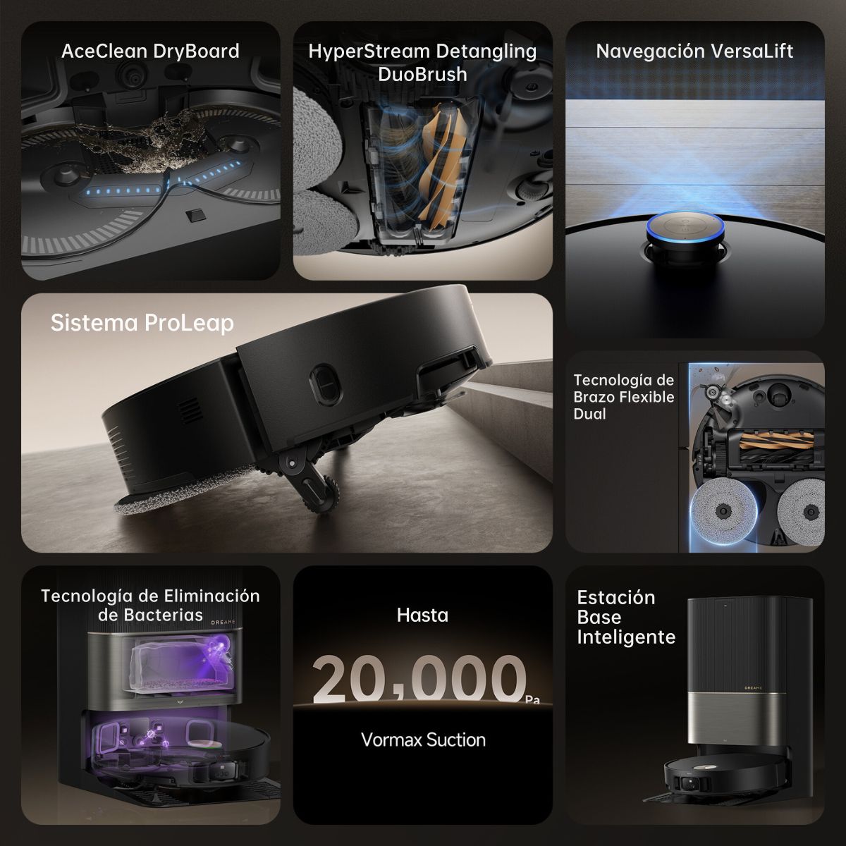 Descubre el Dreame X50 Ultra, el robot aspirador más avanzado de su categoría, diseñado para ofrecer una limpieza profunda, automática y sin interrupciones incluso en entornos complejos. Gracias a su sistema mecánico de elevación, su cuerpo ultradelgado de 8.9 cm y su navegación láser inteligente, este robot llega donde otros no pueden.