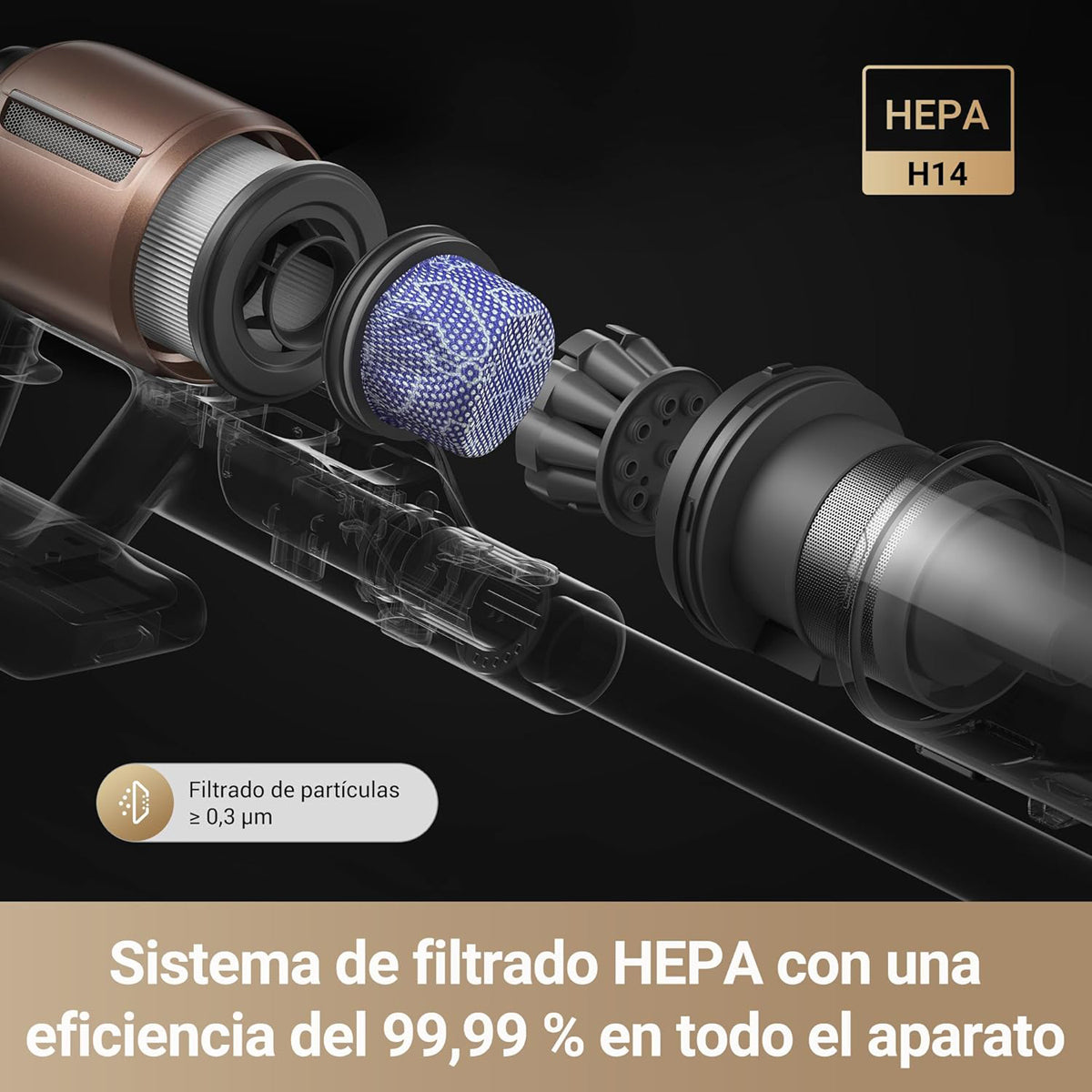 La pantalla LCD integrada te brinda control total, mostrando el modo de limpieza, nivel de succión, duración restante de la batería y alertas importantes en tiempo real. Su gama de accesorios versátiles te permite limpiar rincones estrechos, tapicería, escaleras, muebles y superficies complicadas sin esfuerzo.